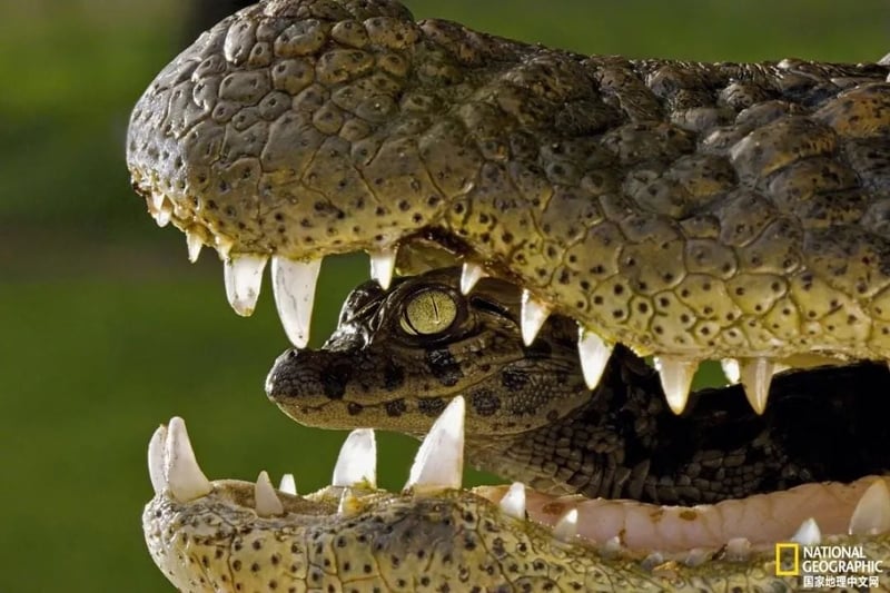 (雌鳄鱼小心地含住小鳄鱼。图片来源:美国国家地理)
